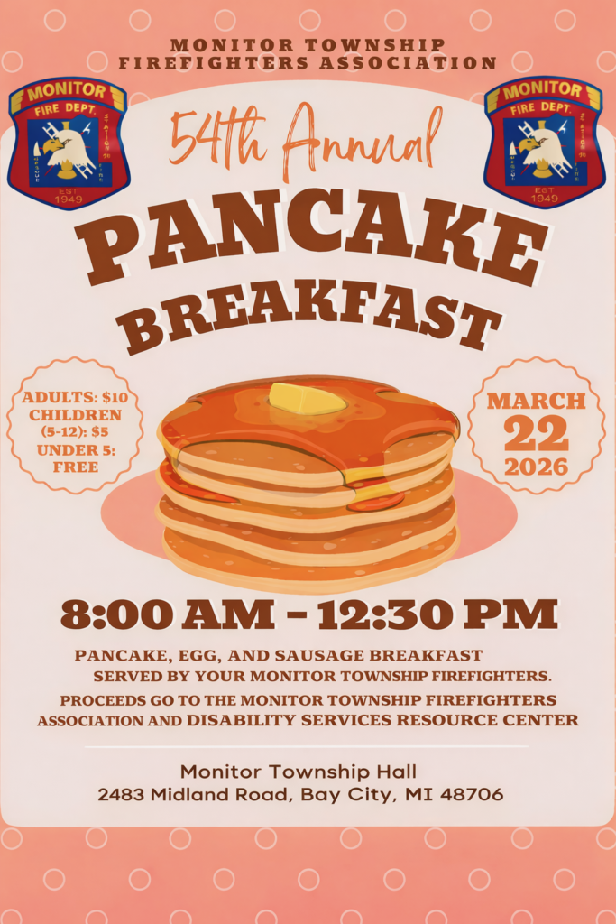All You Can Eat Pancake Breakfast at Monitor Twp. Hall with Some Proceeds to DSRC + Add to Google Calendar + iCal / Outlook export Date Mar 22 2026 Time All Day Cost $10.00 Location Monitor Twp. Hall, 2483 Midland Rd., Bay City, MI 48706 2483 Midland Rd., Bay City, MI 48706 Share this event